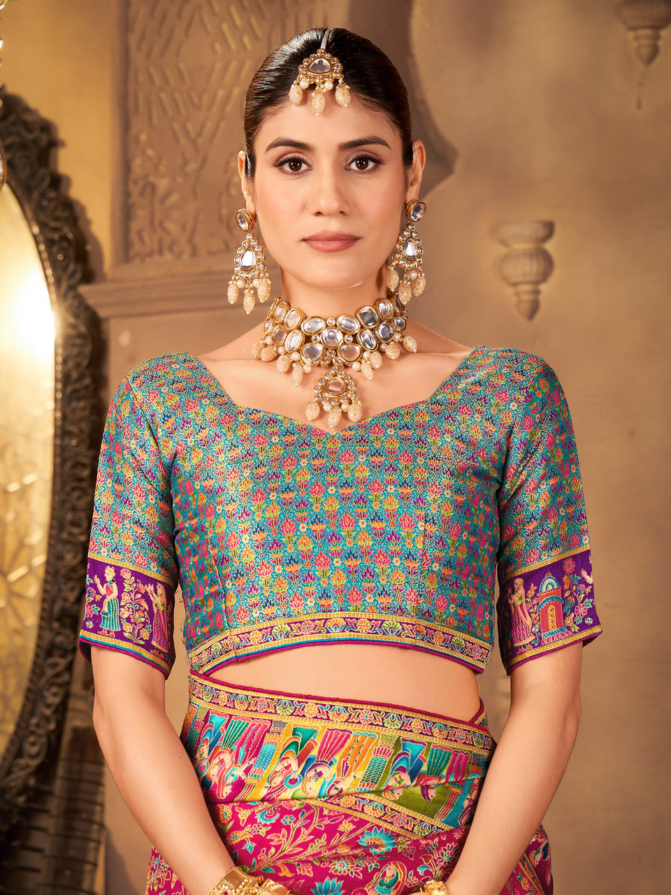 Step into timeless elegance with our Luxurious Dola Silk Saree with Positional Print, a perfect fusion of heritage craftsmanship. Woven from high-quality Dola silk, this saree offers a smooth, lightweight, and graceful drape, making it comfortable to wear while exuding an opulent charm. The intricate Madhubani-inspired motifs tell stories of tradition, culture, and folklore, giving this saree a unique artistic appeal. Every motif is meticulously designed to bring life to the fabric, showcasing skilled craftsmanship passed down through generations. The rich zari work adds a touch of royalty, making it a perfect choice for weddings, festive occasions, and cultural celebrations. A stunning feature of this saree is its multicolor palette, blending vibrant hues that suit all skin tones and add a lively charm to your ensemble. The pallu is adorned with elegant thread tassels, adding playful movement and a hint of modernity to the traditional design. This versatile saree comes with a matching unstitched blouse piece, giving you the freedom to customize the style according to your preferences. Whether you’re attending a wedding, celebrating a festival, or looking for a statement piece for special occasions, this saree will make you stand out with grace and sophistication. Pair it with statement jewelry and a chic hairstyle to complete your look.