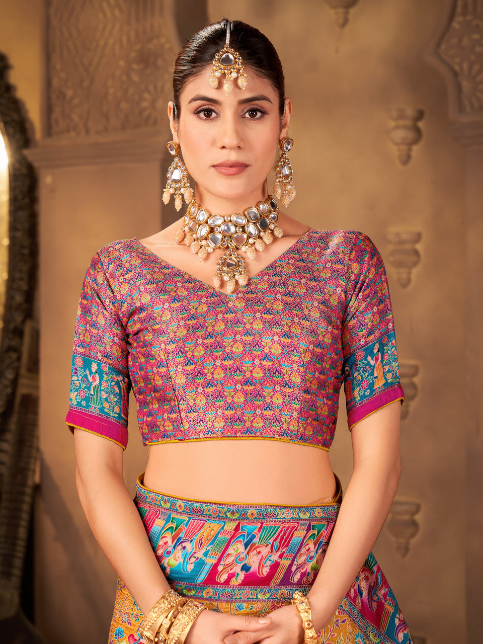 Step into timeless elegance with our Luxurious Dola Silk Saree with Positional Print, a perfect fusion of heritage craftsmanship. Woven from high-quality Dola silk, this saree offers a smooth, lightweight, and graceful drape, making it comfortable to wear while exuding an opulent charm. The intricate Madhubani-inspired motifs tell stories of tradition, culture, and folklore, giving this saree a unique artistic appeal. Every motif is meticulously designed to bring life to the fabric, showcasing skilled craftsmanship passed down through generations. The rich zari work adds a touch of royalty, making it a perfect choice for weddings, festive occasions, and cultural celebrations. A stunning feature of this saree is its multicolor palette, blending vibrant hues that suit all skin tones and add a lively charm to your ensemble. The pallu is adorned with elegant thread tassels, adding playful movement and a hint of modernity to the traditional design. This versatile saree comes with a matching unstitched blouse piece, giving you the freedom to customize the style according to your preferences. Whether you’re attending a wedding, celebrating a festival, or looking for a statement piece for special occasions, this saree will make you stand out with grace and sophistication. Pair it with statement jewelry and a chic hairstyle to complete your look.